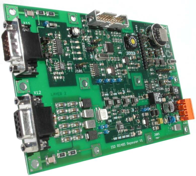The repeater is based on two galvanically isolated half-duplex transmit and receive circuits, which are connected to the ARM7 microcontroller LPC210x via optocouplers. The application on the 32bit controller acts as an intelligent bidirectional FIFO. The directional interlocking is done based on the received data from the respective input. The data appears shortly after on the opposite RS485 output. The controller is currently not used to capacity. This offers much room for extensions in the area of line diagnostics, logging, framing of the data, dynamic measuring of the line parameters, etc.